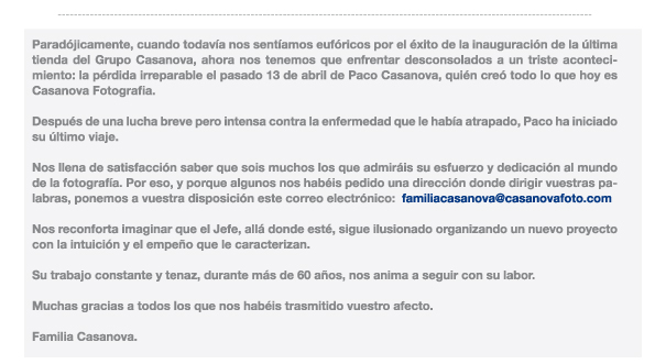 Si no quieres recibir más boletines manda un email con la palabra baja en el asunto a informacion@casanovafoto.com